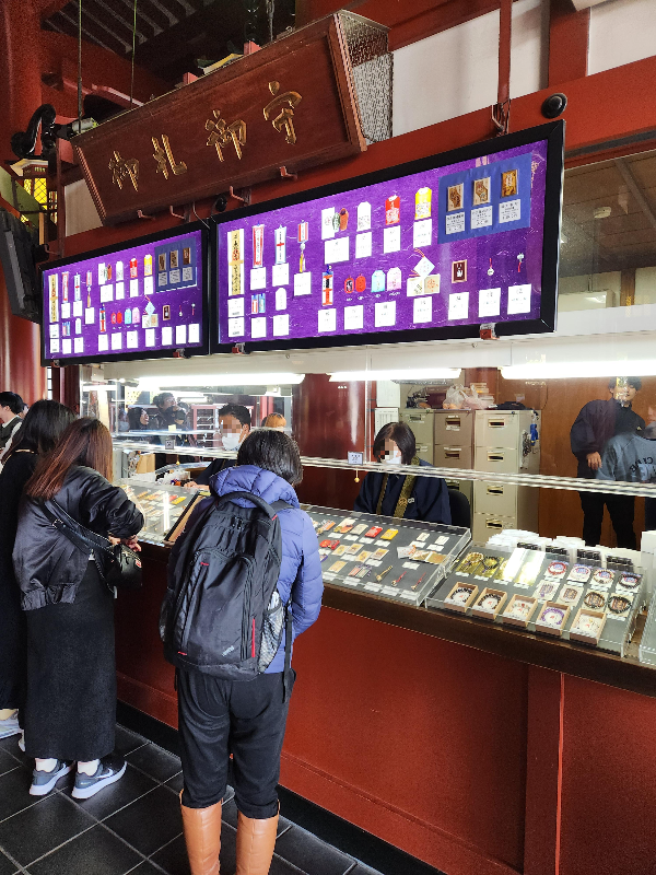 센소지 본당 앞의 오른편에서는 운세 뽑기<오미쿠지>를 할 수 있고, 그 바로 맞은 편에서는 부적같은 기념품을 판매하고 있었습니다.