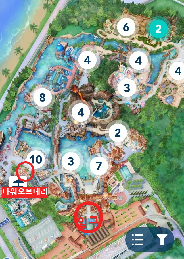 지도의 시계방향으로 동선을 잡았고, 첫번째 어트랙션은 타워오브테러로 정했습니다.